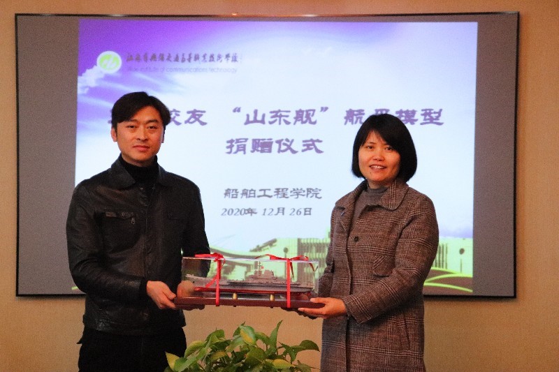 校友王浪向?qū)W院捐贈了“山東艦”航母模型,以激勵廣大船舶學子心懷祖國,發(fā)憤圖強,成為祖國棟梁之才。