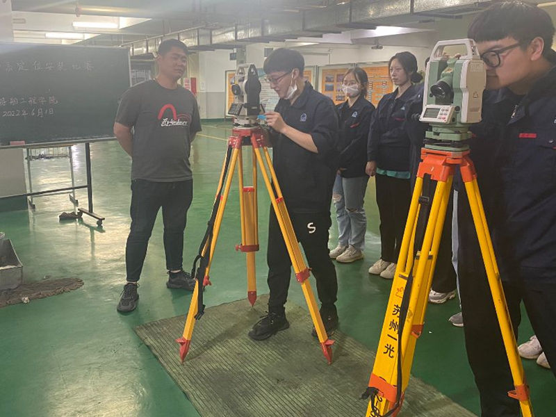 本次比賽共有來(lái)自船舶工程學(xué)院181141班20名同學(xué)參加。比賽要求學(xué)生利用激光電子經(jīng)緯儀(LT 402L)及其三角支架、標(biāo)尺、卷尺、水平尺和扳手等工量具根據(jù)軸系布置圖和賽場(chǎng)給定的標(biāo)記點(diǎn),確定尾基點(diǎn)的位置,再操作使用激光經(jīng)緯儀建立軸系理論中心線,調(diào)整尾軸管位置,最終使尾軸管中心與軸系理論中心線同軸。