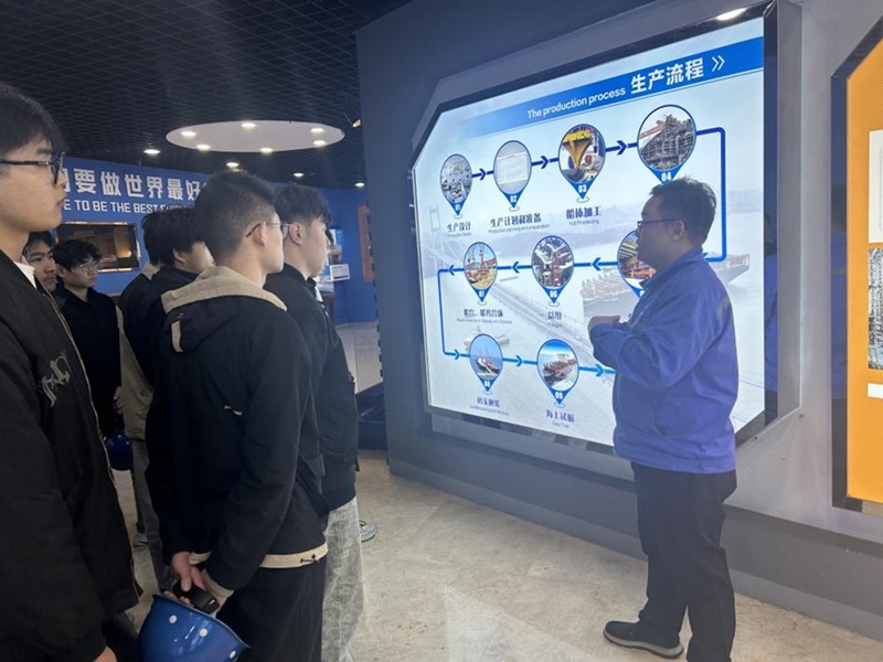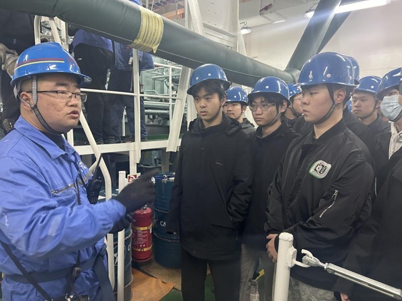 在企業(yè)專家的帶領(lǐng)下,我校師生首先參觀了廠區(qū)船塢、船臺及各個車間,直觀學(xué)習(xí)到了各個船舶分段,并了解了目前企業(yè)主要在建船型,使學(xué)生深刻學(xué)習(xí)到了造船流程。隨后,學(xué)生們登上了一艘5萬噸成品油船,分別參觀了機(jī)艙、甲板、駕駛臺等區(qū)域。企業(yè)專家非常細(xì)致地給學(xué)生講解了主機(jī)、發(fā)電機(jī)、鍋爐、制冷裝置、軸系等重要的機(jī)艙設(shè)備,并介紹了部分技術(shù)非常先進(jìn)的新設(shè)備,讓學(xué)生學(xué)習(xí)到了很多在課堂中難以獲取的新知識,拓寬了專業(yè)知識面。最后,企業(yè)專家為我校師生介紹了揚(yáng)子江集團(tuán)的企業(yè)文化、已建造的典型船舶、企業(yè)發(fā)展愿景等。企業(yè)也非常熱情地表示,后續(xù)會進(jìn)一步加強(qiáng)和我校的合作,共育高素質(zhì)船業(yè)人才。