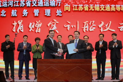學(xué)校黨委書記李虎介紹了學(xué)校專業(yè)建設(shè)情況,對蘇北航務(wù)管理處的捐贈(zèng)義舉表示誠摯的謝意,多年來省蘇北航務(wù)管理處多年來的關(guān)心、支持學(xué)校建設(shè),雙方在人才培養(yǎng)、員工培訓(xùn)等方面開展了多方面合作,雙方同隸屬于江蘇省交通運(yùn)輸廳,學(xué)校有近40名左右校友在省蘇北航務(wù)管理處工作,是親上加親。此次蘇北處的捐贈(zèng)行為也是落實(shí)廳黨組舉廳屬單位之力支持學(xué)校發(fā)展的精神。省蘇北航務(wù)管理處黨委書記周進(jìn)介紹了實(shí)訓(xùn)船情況,通過實(shí)訓(xùn)船的捐助,助推學(xué)校技能型人才的培養(yǎng),并希望雙方今后能開展更多更高層次的交流合作。李虎書記與周進(jìn)書記簽署了交接備忘錄。江蘇省交通運(yùn)輸廳副廳長金凌為新船名揭牌并作了重要講話,表揚(yáng)了學(xué)校這幾年發(fā)展上了一個(gè)很大的臺階,并表示有蘇北處這樣的廳屬單位支持職業(yè)教育的行動(dòng),我們的交通職業(yè)教育一定會發(fā)展的很好,無錫交校的明天一定會更美好。