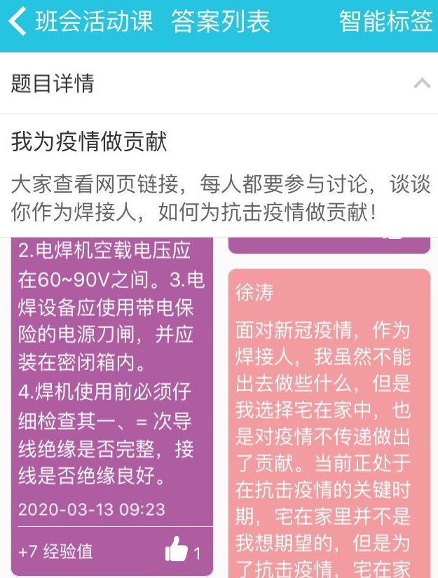3月12日,在班主任滕老師主持下,181121班全體同學(xué)利用云班課平臺(tái)召開(kāi)“我為疫情做貢獻(xiàn)”網(wǎng)絡(luò)主題班會(huì)。滕老師通過(guò)提前發(fā)布焊接工程師者在建設(shè)火神山醫(yī)院的網(wǎng)絡(luò)報(bào)道和相關(guān)照片,讓同學(xué)們展開(kāi)討論,作為焊接專業(yè)學(xué)生,我們?nèi)绾螢榭箵粢咔樽鲐暙I(xiàn)。