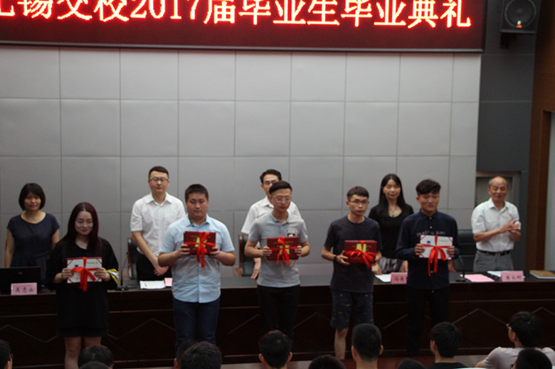 典禮在雄壯的國歌聲中拉開了序幕。馮美仙處長宣讀了《關于頒發(fā)2017屆畢業(yè)生畢業(yè)證書的決定》,各畢業(yè)生代表懷著激動地心情伴隨著大家的掌聲上臺領取畢業(yè)證書。接著,校團委王小明書記宣讀了《關于表彰2017屆優(yōu)秀畢業(yè)生的決定》,并向獲此殊榮的學生表示衷心的祝賀。隨后,顧溢文同學和滕蓓老師分別作為畢業(yè)生代表和班主任代表發(fā)表自己的感言,各種感慨娓娓道出,無不訴說著相互的祝愿。而后,各班主任在學生的鮮花簇擁下潸然淚下,淚水中包含的有對學生畢業(yè)的喜悅、有離別的感傷。之后,一直為畢業(yè)生校園生活辛勤服務的物業(yè)公司韋經理也為畢業(yè)生送上了誠摯的祝福。