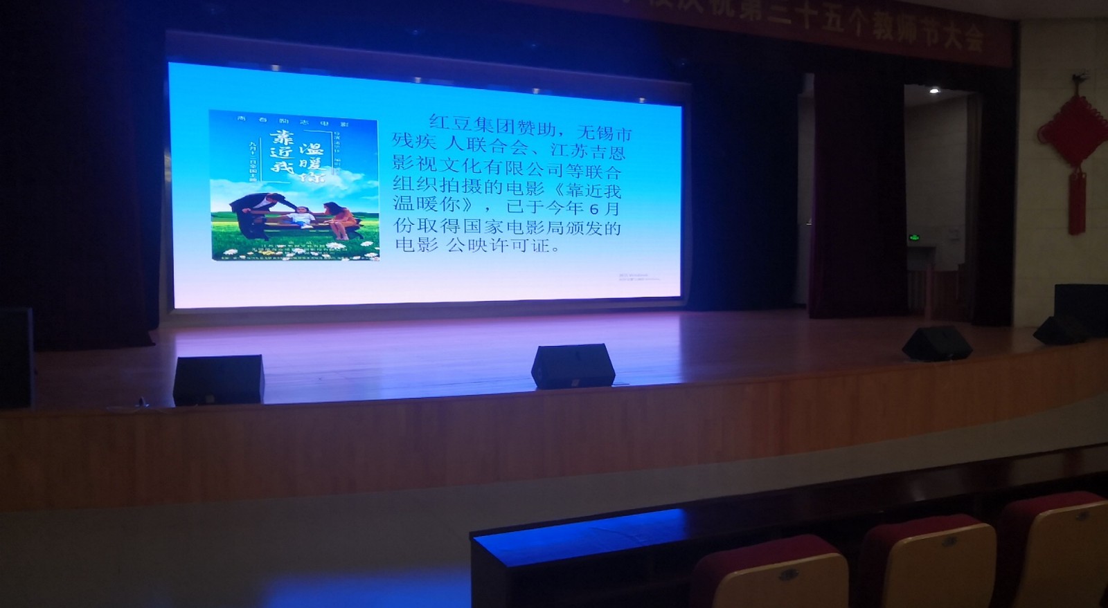 ? ? ? 青春勵志故事片《靠近我溫暖你》,9月12日在全國院線公映,采用輕喜劇愛情片的方式,展示了人性平凡而偉大的一面,情節(jié)感人至深,催人奮進。根據(jù)江蘇省殘聯(lián)、江蘇省教育廳、江蘇省總工會、共青團江蘇省委和江蘇省婦聯(lián)的通知精神,經(jīng)研究,校工會2019年9月18日(周三)15:30組織全校教職工和部分學生,計700多人在錢榮校區(qū)南校園致遠樓四樓大禮堂觀看了影片。