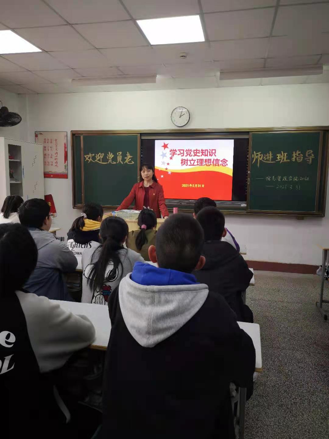 為進(jìn)一步加強(qiáng)黨史學(xué)習(xí)教育,引導(dǎo)學(xué)生牢固樹立正確的世界觀、人生觀和價(jià)值觀,幫助學(xué)生堅(jiān)定理想信念,明確學(xué)習(xí)目的和努力方向,切實(shí)加強(qiáng)學(xué)生的思想政治教育。3月31日下午,組織人事處黨支部書記邵敏珠走進(jìn)信息管理學(xué)院201611班,開展“學(xué)習(xí)黨史知識,樹立理想信念”主題教育活動(dòng)。
