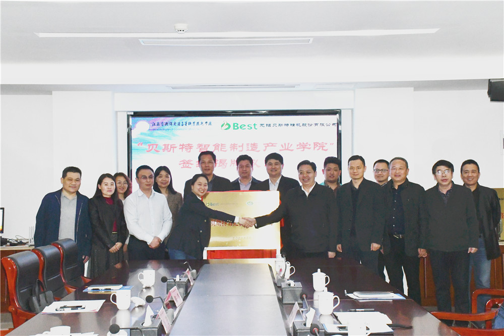 簽約儀式上,學(xué)校與貝斯特有限公司共同簽署了協(xié)議書,校企雙方共同為貝斯特智能制造產(chǎn)業(yè)學(xué)院揭牌。學(xué)校相關(guān)學(xué)院、職能處室負(fù)責(zé)人,貝斯特方相關(guān)部門負(fù)責(zé)人共同見證了此次簽約揭牌。