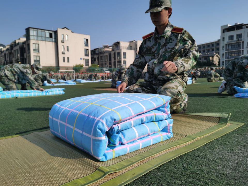 經(jīng)過幾天緊張的模擬訓(xùn)練,學(xué)生們都躍躍欲試,摩拳擦掌,一展風(fēng)采。100名新生有序地來到操場,進(jìn)行一場疊被子技能大比拼,伴隨著口令,他們立即進(jìn)入狀態(tài),迅速蹲下,鋪平、壓實(shí)、翻折、摳角、捏線,熟練地疊起被子,有的還以尺子予以輔助。