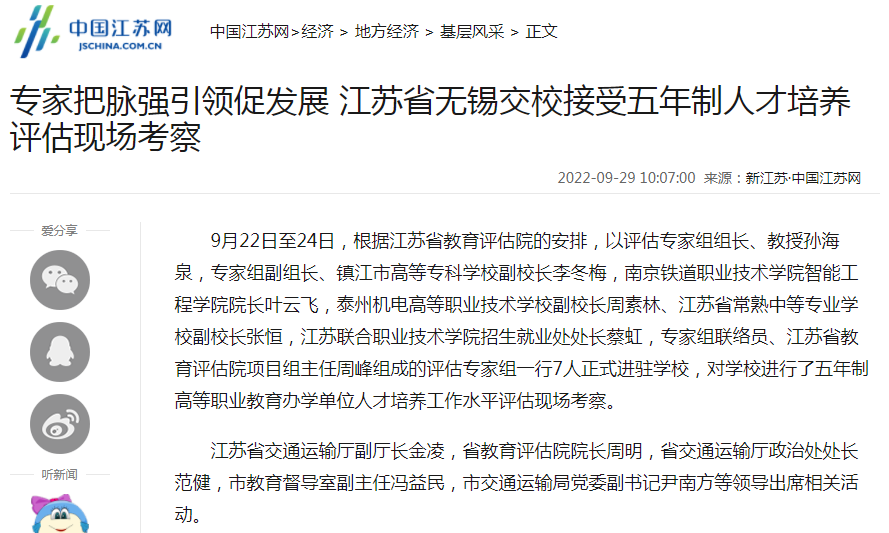 中江網(wǎng):專家把脈強(qiáng)引領(lǐng)促發(fā)展 江蘇省無錫交校接受五年制人才培養(yǎng)評估現(xiàn)場考察