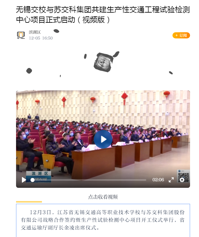 無錫博報(bào):無錫交校與蘇交科集團(tuán)共建生產(chǎn)性交通工程試驗(yàn)檢測中心項(xiàng)目正式啟動(視頻版)