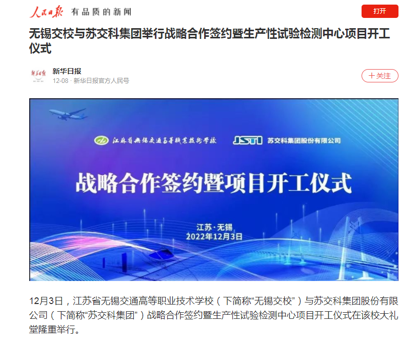 人民日?qǐng)?bào):無(wú)錫交校與蘇交科集團(tuán)舉行戰(zhàn)略合作簽約暨生產(chǎn)性試驗(yàn)檢測(cè)中心項(xiàng)目開工儀式