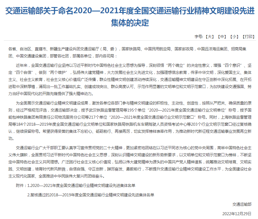 近日,交通運(yùn)輸部發(fā)布《交通運(yùn)輸部關(guān)于命名2020—2021年度全國交通運(yùn)輸行業(yè)精神文明建設(shè)先進(jìn)集體的決定》(交政研發(fā)〔2022〕130號(hào)),公布了2020—2021年度全國交通運(yùn)輸行業(yè)精神文明建設(shè)先進(jìn)集體名單,學(xué)校榮獲“2020—2021年度全國交通運(yùn)輸行業(yè)文明單位”稱號(hào)。