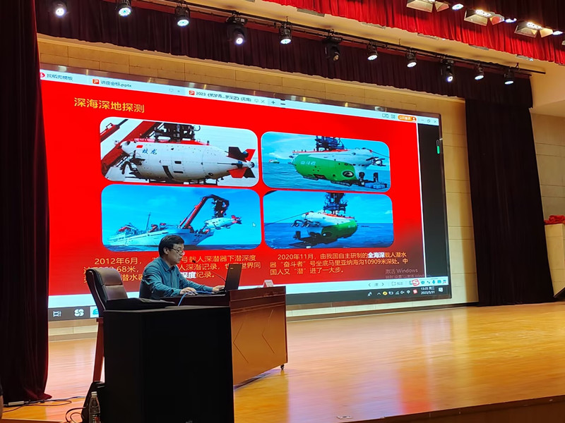 謝榮教授以黨的二十大報告金句“發(fā)展海洋經(jīng)濟,保護海洋生態(tài)環(huán)境,加快建設(shè)海洋強國”為切入點,從向海圖強,海洋強國藍色信念;強國使命,當代海洋人才較量;深耕海洋,深藍之夢開啟地方;圓夢深藍,中華民族偉大復興等四個方面進行講座。