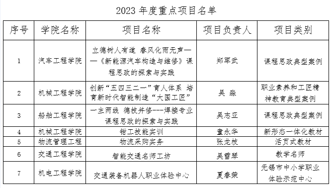近日,無錫市教育局公布了無錫市職業(yè)教育質(zhì)量提升攀登計劃2023年度重點項目,我校11個項目入選:智能交通名師工坊認(rèn)定為無錫市職業(yè)教育名師工坊;《立德樹人有道 春風(fēng)化雨無聲—<新能源汽車構(gòu)造與維修>》課程思政的探索與實踐》和《一主兩線 德技并修—焊接專業(yè)課程思政的探索與實踐》兩個項目認(rèn)定為課程思政典型案例;《創(chuàng)新“五四三二一”育人體系 培育新時代智能制造“大國工匠”》被認(rèn)定為職業(yè)素養(yǎng)和工匠精神教育典型案例;沈力輝、姚柯、陶建華、金學(xué)恒等4名同學(xué)認(rèn)定為技能雛鷹;《鉗工技能實訓(xùn)》認(rèn)定為新形態(tài)一體化教材;《物流采購實務(wù)》被認(rèn)定為活頁式教材;交通裝備機器人職業(yè)體驗中心被認(rèn)定為無錫市中小學(xué)職業(yè)體驗示范中心。