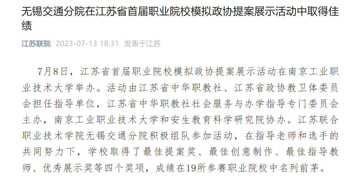 無錫交通分院在江蘇省首屆職業(yè)院校模擬政協(xié)提案展示活動中取得佳績 (qq.com)