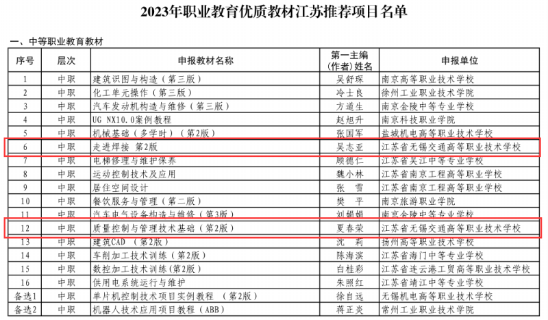 近日,省教育廳組織了2023年職業(yè)教育優(yōu)質(zhì)教材推薦申報工作,經(jīng)專家評審、教育廳公示,全省有16部教材入選,其中學(xué)校吳志亞教授主編的《走進(jìn)焊接 第2版》和夏春榮教授主編的《質(zhì)量控制與管理技術(shù)基礎(chǔ)》2部教材入選2023年職業(yè)教育優(yōu)質(zhì)教材江蘇推薦正選項目,取得教材建設(shè)新突破。
