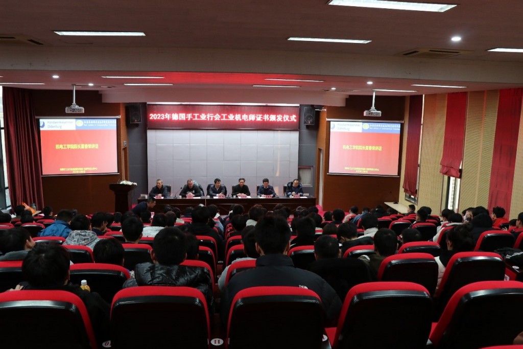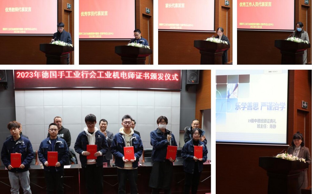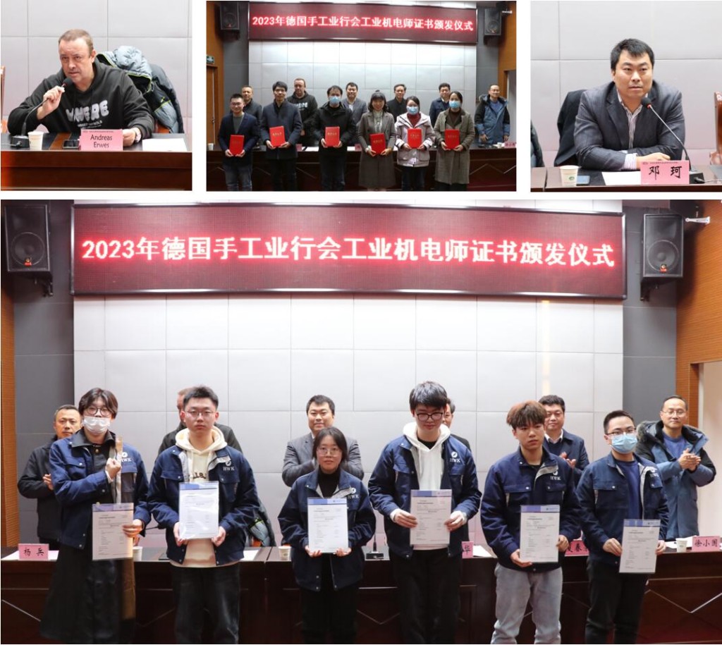 為總結(jié)中德班教學(xué)成果,表彰表現(xiàn)優(yōu)異的學(xué)生、教師,激勵(lì)更多中德班學(xué)生踔厲奮發(fā),勇毅前行,12月5日,德國手工業(yè)行會(huì)中國項(xiàng)目辦與學(xué)校聯(lián)合舉辦了2023年德國手工業(yè)行會(huì)工業(yè)機(jī)電師證書頒發(fā)儀式。
