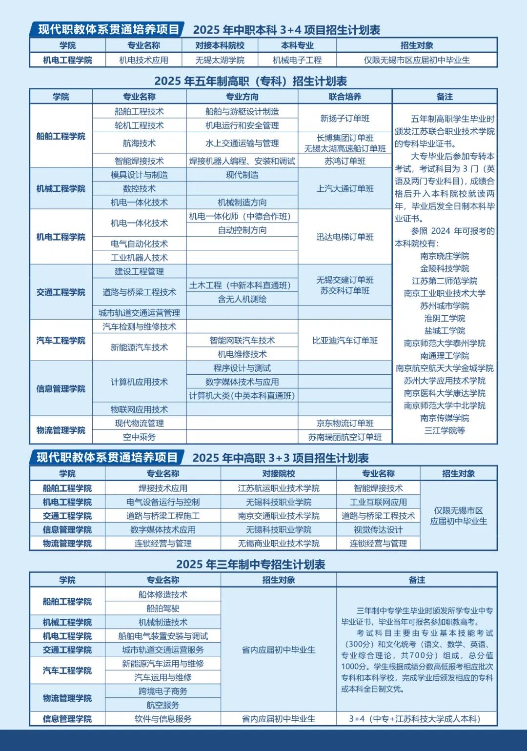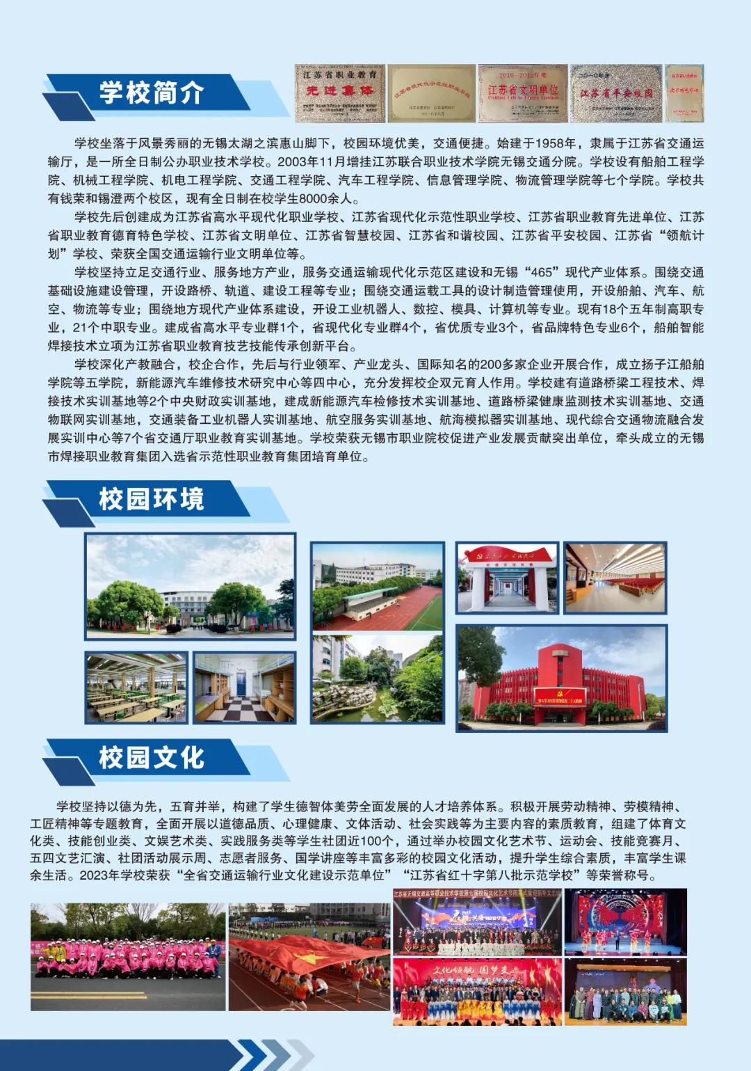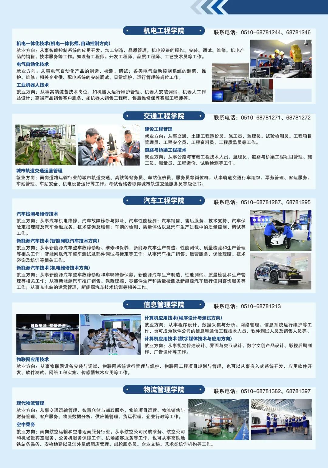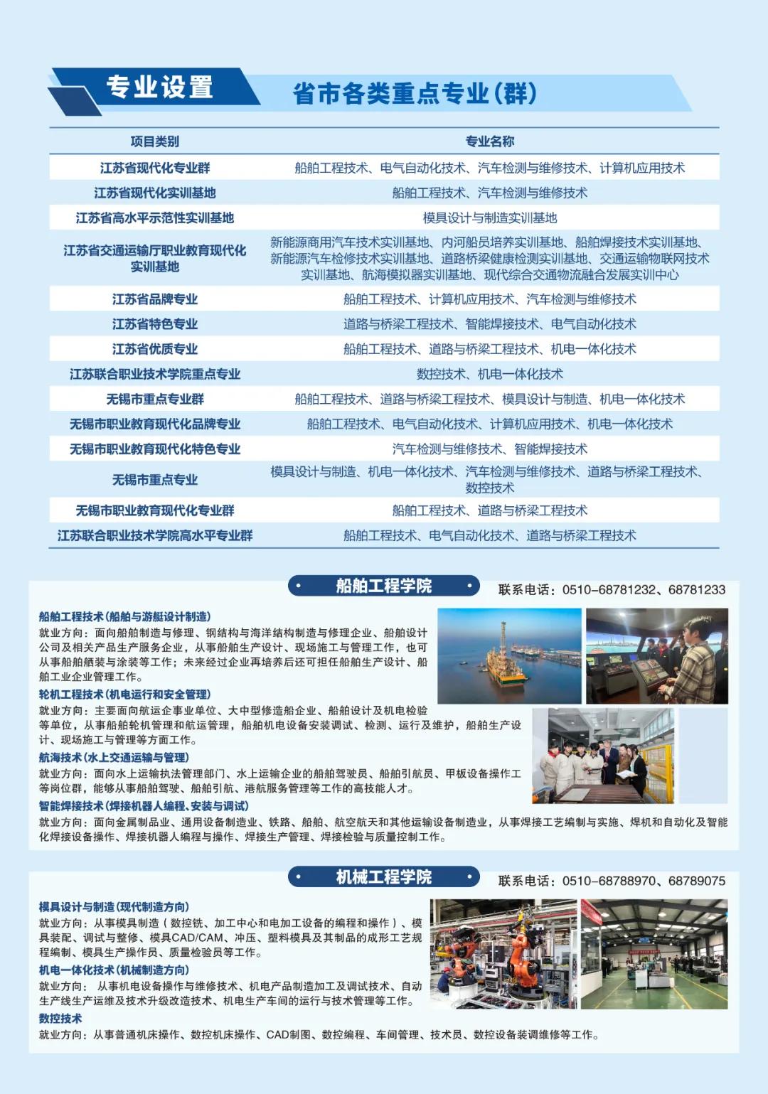 學校堅持立足交通行業(yè)、服務地方產業(yè),服務交通運輸現代化示范區(qū)建設和無錫“465”現代產業(yè)體系。圍繞交通基礎設施建設管理,開設路橋、軌道、建設工程等專業(yè);圍繞交通運載工具的設計制造管理使用,開設船舶、汽車、航空、物流等專業(yè);圍繞地方現代產業(yè)體系建設,開設工業(yè)機器人、數控、模具、計算機等專業(yè)?,F有18個五年制高職專業(yè),21個中職專業(yè)。建成省高水平專業(yè)群1個,省現代化專業(yè)群4個,省優(yōu)質專業(yè)3個,省品牌特色專業(yè)6個,船舶智能焊接技術立項為江蘇省職業(yè)教育技藝技能傳承創(chuàng)新平臺。