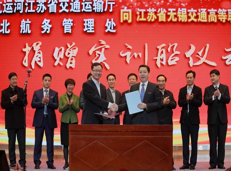 學校黨委書記李虎介紹了學校專業(yè)建設情況,對蘇北航務管理處的捐贈義舉表示誠摯的謝意,多年來省蘇北航務管理處多年來的關心、支持學校建設,雙方在人才培養(yǎng)、員工培訓等方面開展了多方面合作,雙方同隸屬于江蘇省交通運輸廳,學校有近40名左右校友在省蘇北航務管理處工作,是親上加親。此次蘇北處的捐贈行為也是落實廳黨組舉廳屬單位之力支持學校發(fā)展的精神。省蘇北航務管理處黨委書記周進介紹了實訓船情況,通過實訓船的捐助,助推學校技能型人才的培養(yǎng),并希望雙方今后能開展更多更高層次的交流合作。李虎書記與周進書記簽署了交接備忘錄。江蘇省交通運輸廳副廳長金凌為新船名揭牌并作了重要講話,表揚了學校這幾年發(fā)展上了一個很大的臺階,并表示有蘇北處這樣的廳屬單位支持職業(yè)教育的行動,我們的交通職業(yè)教育一定會發(fā)展的很好,無錫交校的明天一定會更美好。