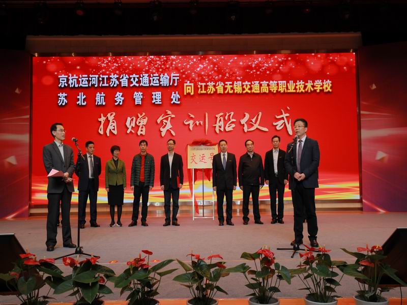 在學校六十年華誕之際,省蘇北航務管理處向?qū)W校捐贈一艘實訓船。2018年11月18日下午,在學校大禮堂舉行實訓船捐贈儀式。江蘇省交通運輸廳副廳長金凌出席捐贈儀式,為新船名揭牌并作重要講話。省蘇北航務管理處黨委書記周進,龍寅生副處長 ,無錫市地方海事局副局長黃怡忠,全體校領導、部分師生代表參加了損贈儀式,儀式由陸春其校長主持。