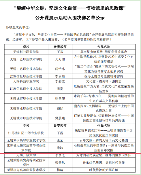 近日,馬克思主義學院組織教師參加了無錫市教育局等三部門開展的“賡續(xù)中華文脈、堅定文化自信——博物館里的思政課”公開課展示活動。5月20日,官方公示了初賽結(jié)果,朱沛老師的作品《石磨裂痕里的中國筋骨:一座城與民族工商業(yè)的百年突圍》入圍決賽。