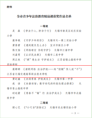 近日,在無(wú)錫市教育局主辦的"法潤(rùn)校園 護(hù)航成長(zhǎng)"全市青少年法治教育精品課征集活動(dòng)中,聶婷婷老師的作品《清朗網(wǎng)絡(luò) 法治護(hù)航——向“按鍵”傷人說(shuō)“不”》榮獲一等獎(jiǎng)。