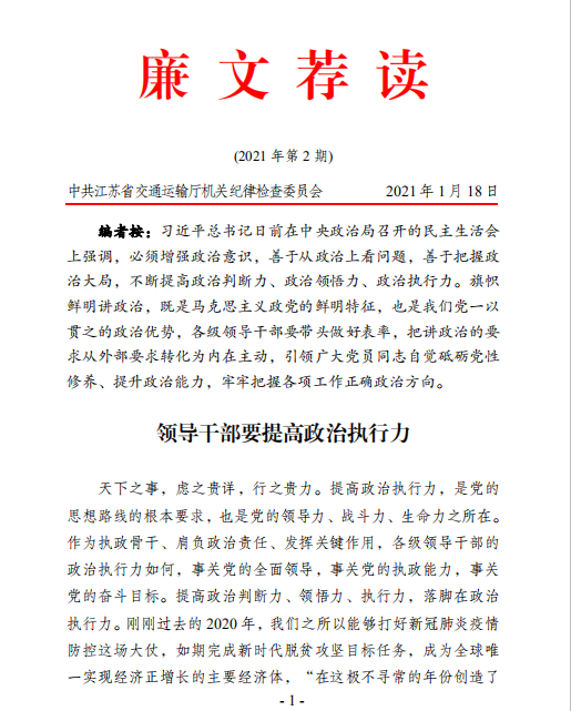 廉文薦讀2021年第2期——領(lǐng)導(dǎo)干部要提高政治執(zhí)行力