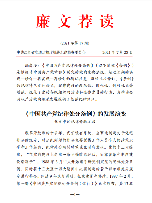 2021年廉文薦讀第17期——《中國共產(chǎn)黨紀(jì)律處分條例》的發(fā)展演變