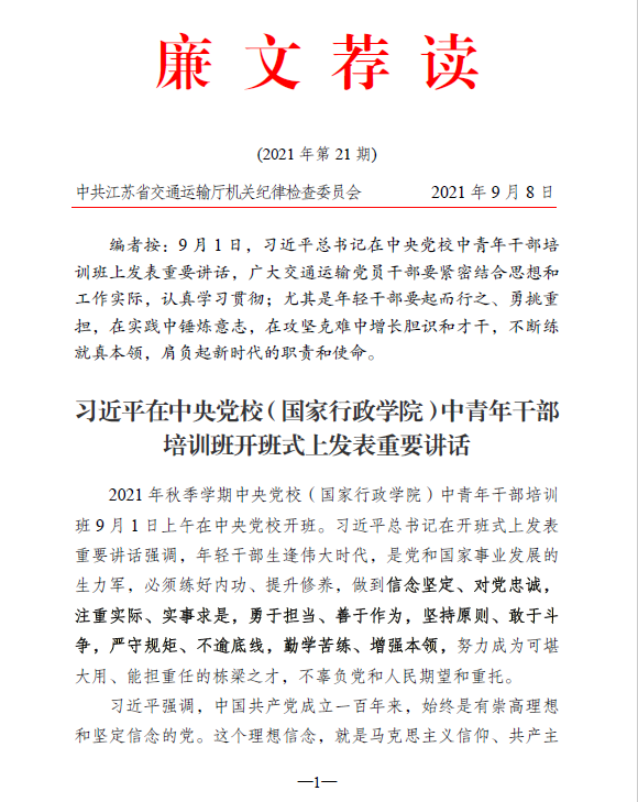 2021年廉文薦讀第21期——習(xí)近平在中央黨校(國(guó)家行政學(xué)院)中青年干部培訓(xùn)班開(kāi)班式上發(fā)表重要講話(huà)
