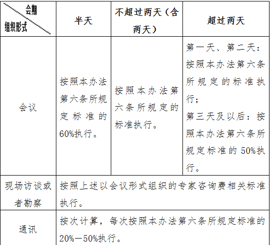 第九條 不同形式組織的專家咨詢活動適用專家咨詢費標準如下:
