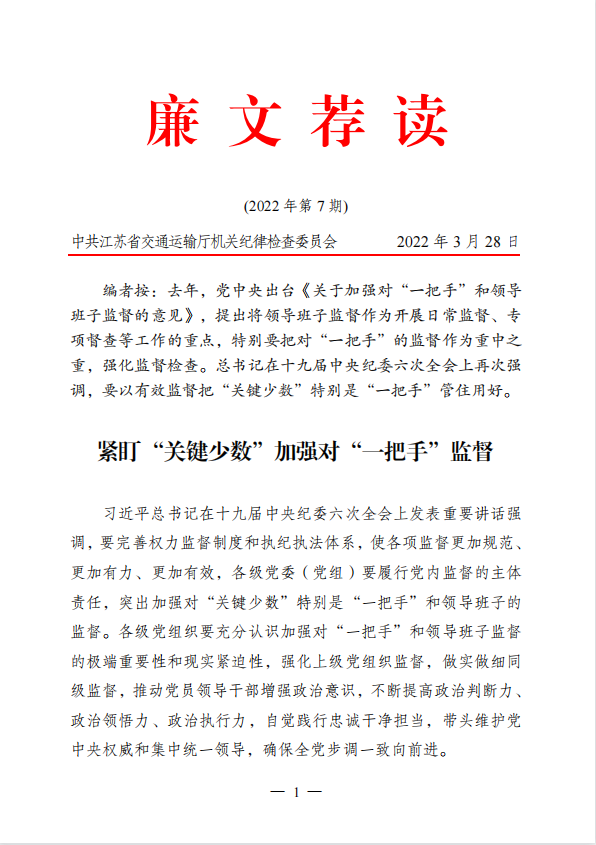 2022年廉文薦讀第7期——緊盯“關(guān)鍵少數(shù)”加強對“一把手”監(jiān)督