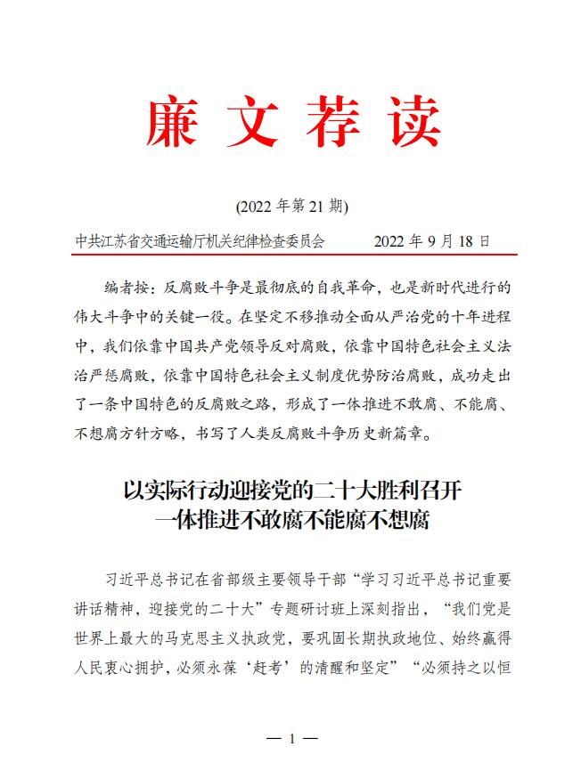 2022年廉文薦讀第21期——以實際行動迎接黨的二十大勝利召開 一體推進不敢腐不能腐不想腐