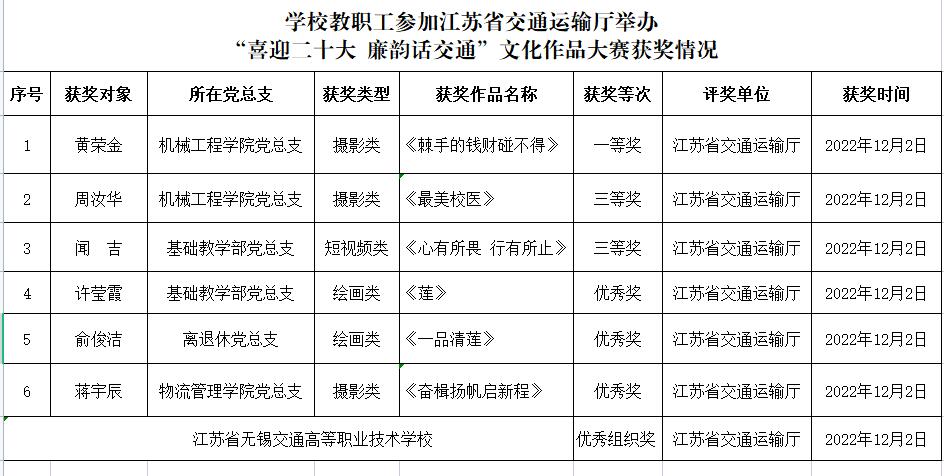 近日,江蘇省交通運(yùn)輸廳通報(bào)了關(guān)于“喜迎二十大 廉韻話交通”文化作品大賽評(píng)選結(jié)果,學(xué)校在多個(gè)類目中獲得優(yōu)異成績,黃榮金老師的攝影類作品《棘手的錢財(cái)碰不得》榮獲一等獎(jiǎng),周汝華老師的攝影作品《最美校醫(yī)》榮獲三等獎(jiǎng),聞吉老師的短視頻作品《心有所畏 行有所止》榮獲三等獎(jiǎng),許瑩霞老師的繪畫作品《蓮》、俞俊潔老師的繪畫作品《一品清蓮》、蔣宇辰老師的攝影作品《奮楫揚(yáng)帆啟新程》分獲優(yōu)秀獎(jiǎng),學(xué)校在此次活動(dòng)中被授予“優(yōu)秀組織獎(jiǎng)”。