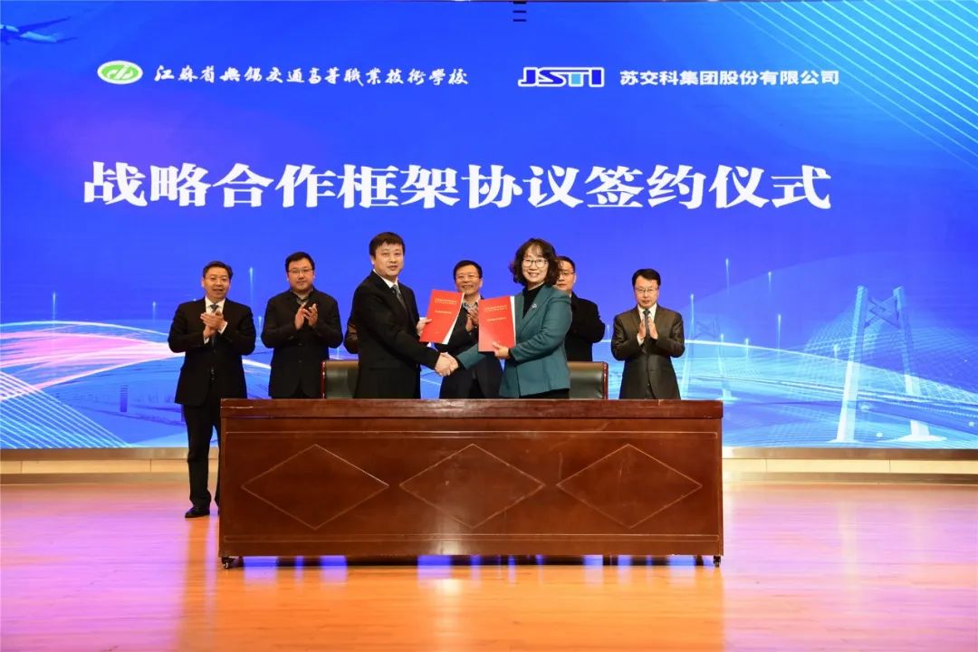 學(xué)校黨委副書記、五級(jí)職員朱雨蘭與蘇交科集團(tuán)副總裁計(jì)月華共同簽訂戰(zhàn)略合作協(xié)議。耿興華副校長(zhǎng)與蘇交科副總裁王衛(wèi)共同簽訂共建生產(chǎn)性交通工程試驗(yàn)檢測(cè)中心協(xié)議。