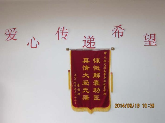 2014年6月10日,為101422班學(xué)生朱孟南同學(xué)家長捐款的儀式在交通工程系系部會議室舉行。交通工程系書記毛蘭霞老師、朱孟南同學(xué)及各班級代表參加了此次儀式。毛書記將飽含交通系師生情誼的14845.5元捐款交給朱孟南,朱孟南代表其全家向全系師生表達(dá)了深深的謝意,并將“慷慨解囊助醫(yī) 真情大愛無疆”錦旗獻(xiàn)給系部。最后,毛書記贊揚(yáng)了全系師生無私的奉獻(xiàn)精神,感謝全系師生用實際行動詮釋了“仁愛”的真諦。祝朱孟南家庭早日渡過難關(guān)!