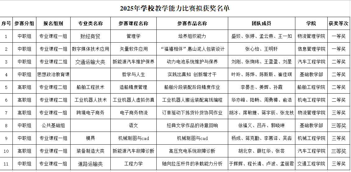 根據(jù)學(xué)校《關(guān)于舉辦2025年教師教學(xué)能力比賽的通知》,學(xué)校啟動了2025年教學(xué)能力比賽評比工作,共收到各院部的推薦作品15個。教務(wù)處聘請并組織專家對參賽作品進行了評審,擬確定《培養(yǎng)組織能力》等2個參賽作品為一等獎,《動力電池系統(tǒng)維護與保養(yǎng)》等4個參賽作品為二等獎,《訂單驅(qū)動下揀貨補貨協(xié)同作業(yè)》等5個參賽作品為三等獎,現(xiàn)予以公示。