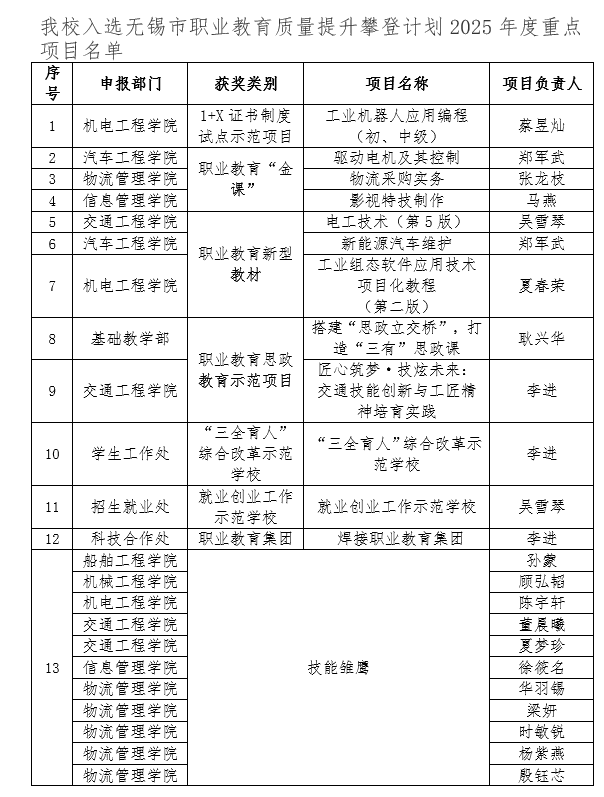 近日,無錫市教育局公布了無錫市職業(yè)教育質(zhì)量提升攀登計劃2025年度重點項目,我校12個項目入選、夏夢珍等11名同學(xué)被認(rèn)定為“技能雛鷹”。