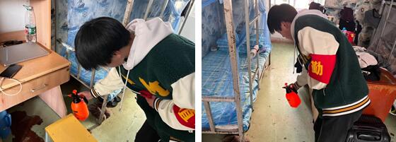 在消殺過程中,學(xué)生會的同學(xué)們嚴(yán)格執(zhí)行消殺工作,并落實到每一個宿舍,每一個角落,盡可能讓消殺更全面,讓病菌無法傳染到宿舍的每一位同學(xué)。