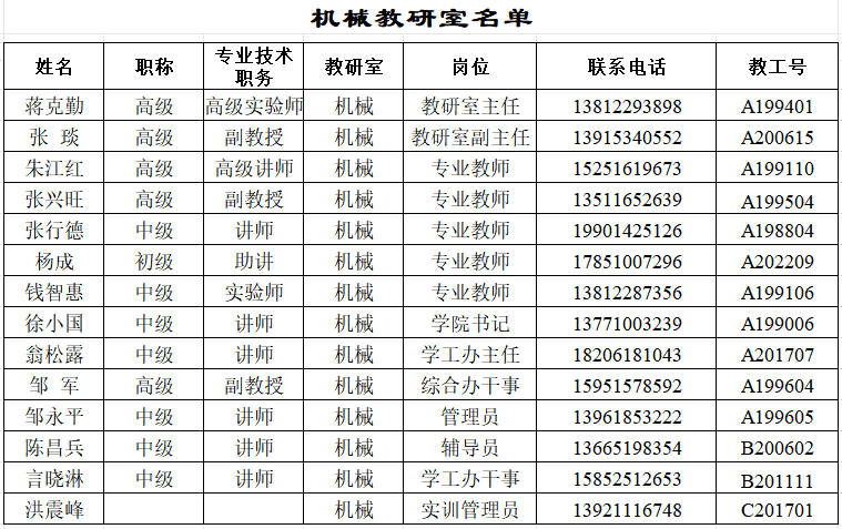 機械工程學院機械教研室人員情況