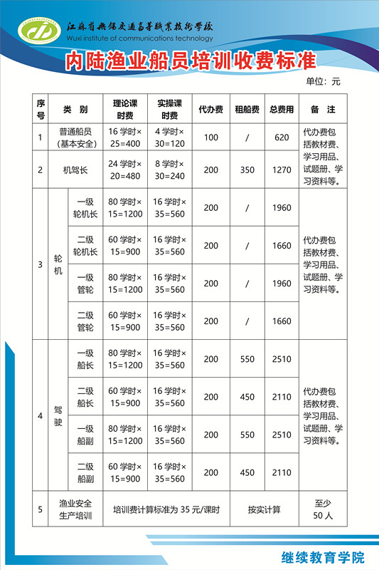 江蘇省無(wú)錫交通高等職業(yè)技術(shù)學(xué)校 內(nèi)河船員培訓(xùn)收費(fèi)標(biāo)準(zhǔn)