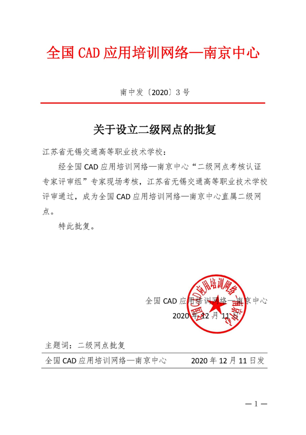 2020年12月11日,經(jīng)全國CAD應(yīng)用培訓(xùn)網(wǎng)絡(luò)——南京中心“二級(jí)網(wǎng)點(diǎn)考核認(rèn)證專家評(píng)審組”專家現(xiàn)場(chǎng)考核與評(píng)審,我校獲全國CAD應(yīng)用培訓(xùn)網(wǎng)絡(luò)——南京中心二級(jí)網(wǎng)點(diǎn)認(rèn)證資格。