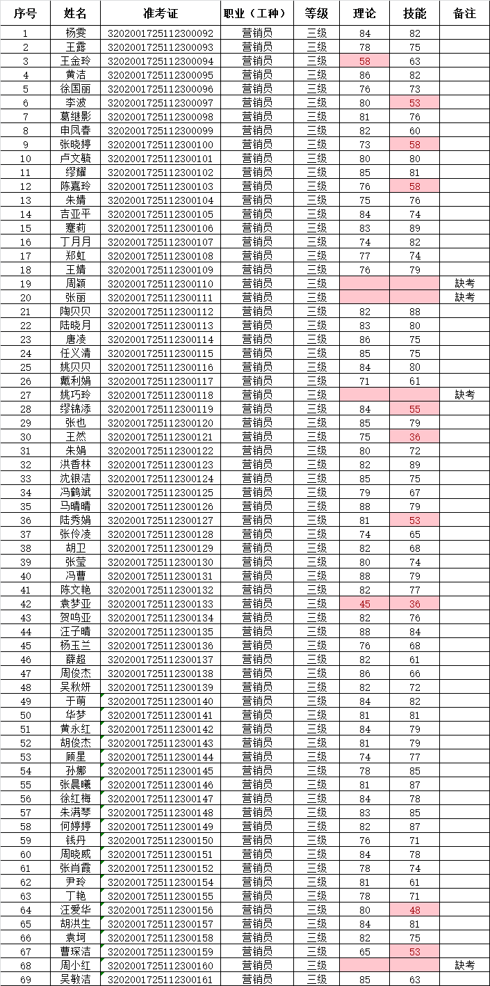 2025年11月23日,69名企業(yè)人員參加營銷員三級技能等級認定考試(考試批次:2025-32020017-00045),共計55名成績獲得合格。現(xiàn)將考試成績公示如下: