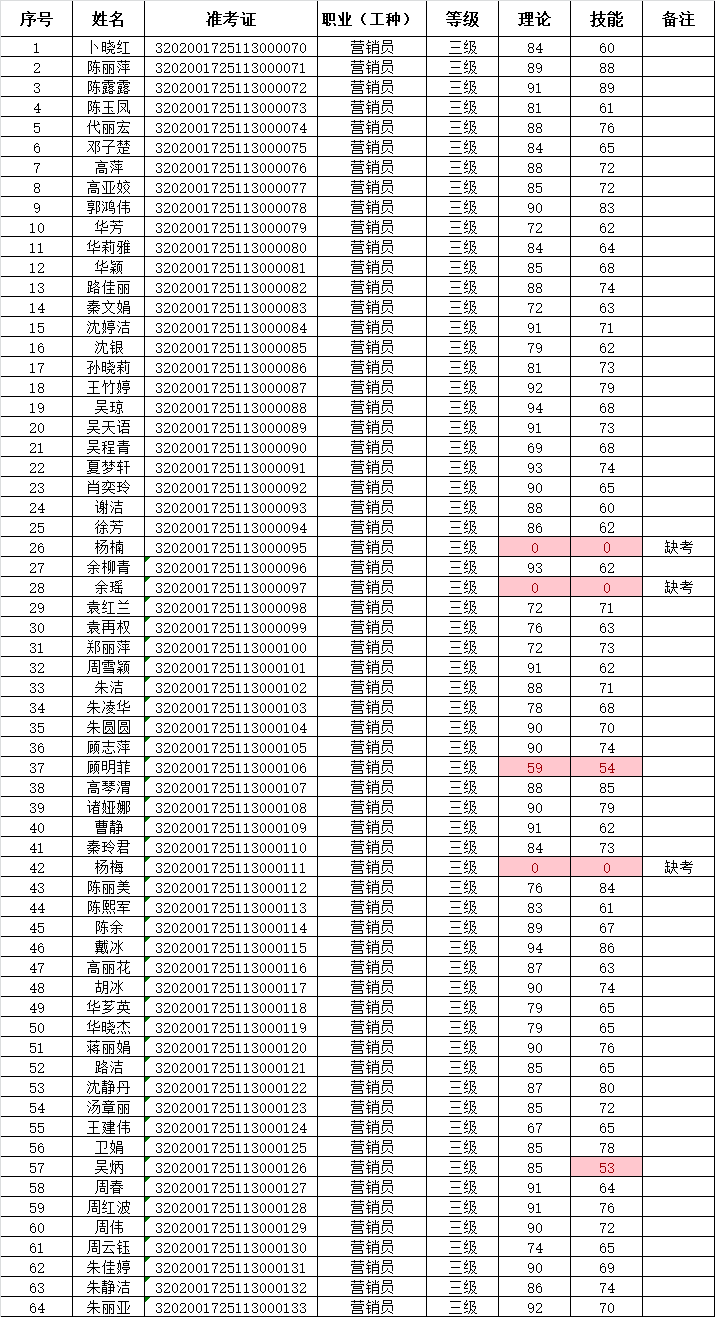 2025年11月30日,64名企業(yè)人員參加營(yíng)銷(xiāo)員三級(jí)技能等級(jí)認(rèn)定考試(考試批次:2025-32020017-00046),共計(jì)59名成績(jī)獲得合格。現(xiàn)將考試成績(jī)公示如下:
