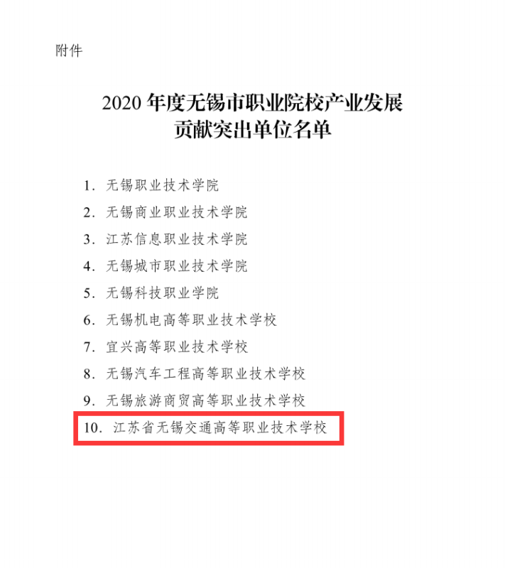 12月8日,無錫市教育局發(fā)布了《關于公布無錫市職業(yè)院校促進產(chǎn)業(yè)發(fā)展貢獻突出單位名單的通知》(錫教發(fā)〔2020〕101號),我校獲評“2020年度無錫市職業(yè)院校促進產(chǎn)業(yè)發(fā)展貢獻突出單位”,并獲30萬補助。