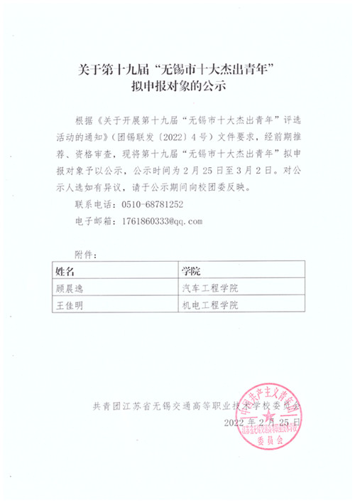 關(guān)于第十九屆“無(wú)錫市十大杰出青年” 擬申報(bào)對(duì)象的公示
