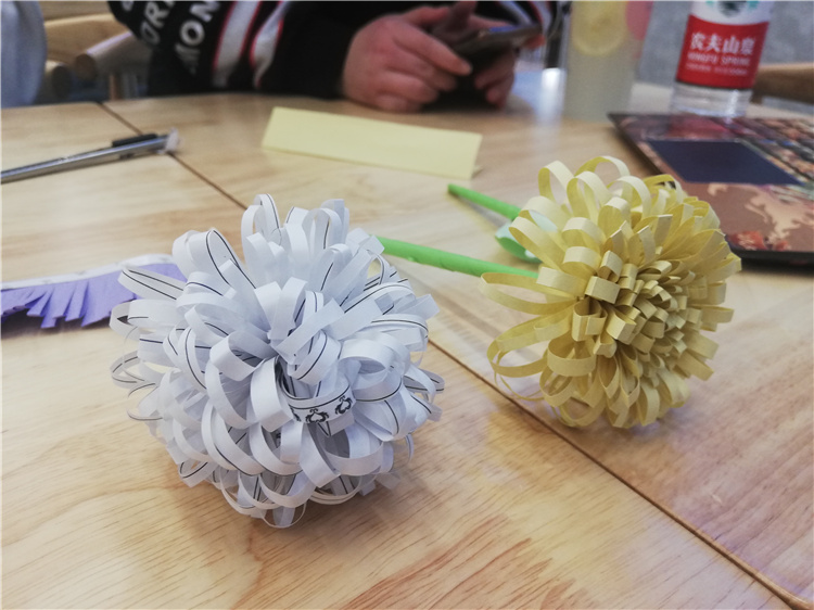 指導教師許瑩霞老師和邵平平老師指導學生動手折菊花,用以懷念和紀念英烈們。社員們用簡單的材料,熟練的手工技藝快速制作了多朵菊花,雖然比較簡易,但是代表了社員們最真誠的敬意。