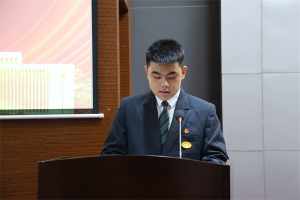 各二級(jí)學(xué)院團(tuán)總支書記為新團(tuán)員代表頒發(fā)團(tuán)員證并佩戴團(tuán)徽。佩戴著嶄新的團(tuán)徽,新團(tuán)員們?cè)谛F(tuán)委委員張婷的帶領(lǐng)下,面對(duì)團(tuán)旗,舉起右手,緊握拳頭,莊嚴(yán)宣誓。宣誓聲鏗鏘有力,回蕩在報(bào)告廳內(nèi),表達(dá)了新團(tuán)員們堅(jiān)定的信念和決心。