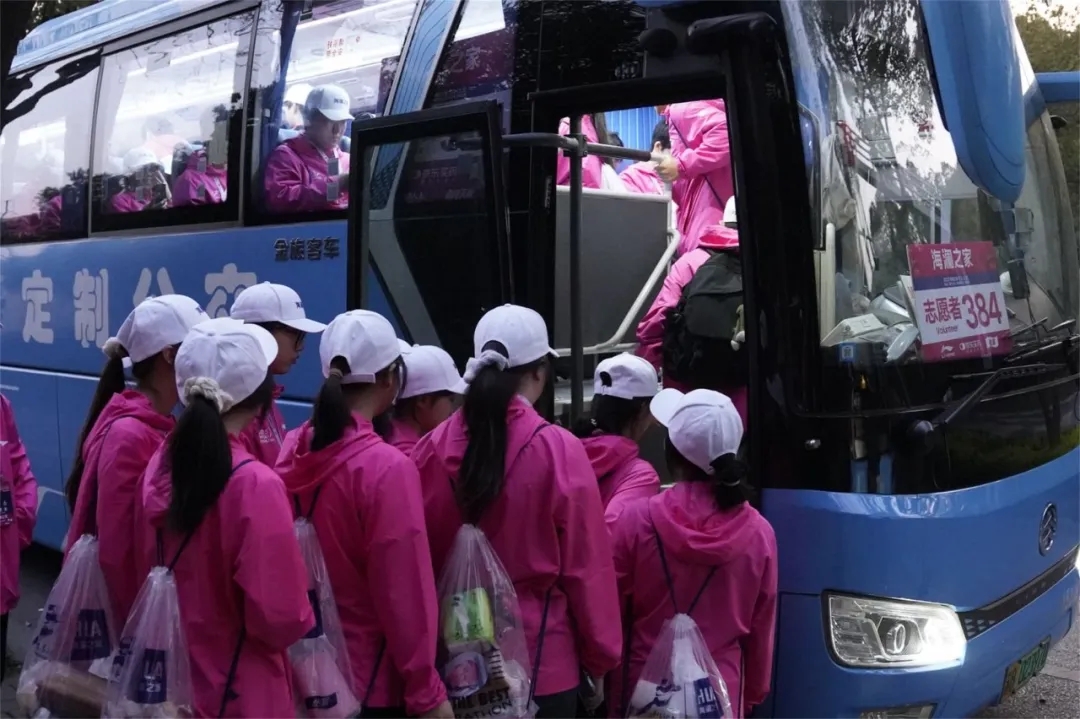 3月23日清晨6點(diǎn),當(dāng)城市還未完全“蘇醒”,停在無錫交校門口的大巴車外,已聚集了一群身著“櫻花粉”的志愿者。420余名馬拉松志愿者整裝待發(fā),即將前往無錫馬拉松保障點(diǎn)位。