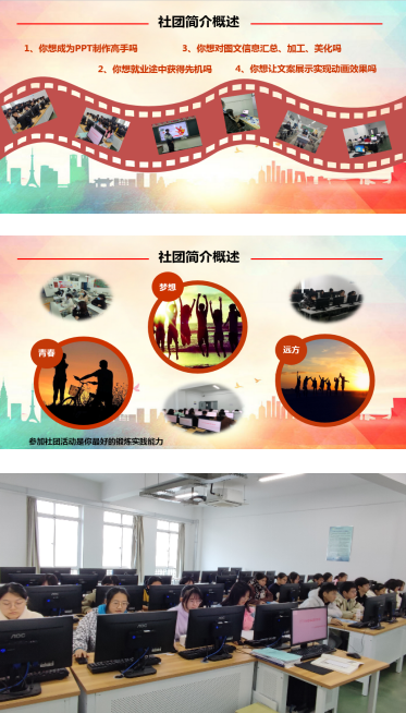 煉機會的平臺,是大學生活不可或缺的一部分,也可讓相同愛好的同學齊聚一堂、攜手奮斗、共同成長。社團招新至今已走過三個春秋,PPT幻動社始終踐行“立足學院,面向全校,塑造優(yōu)秀文化,培養(yǎng)技能人才”的發(fā)展目標。