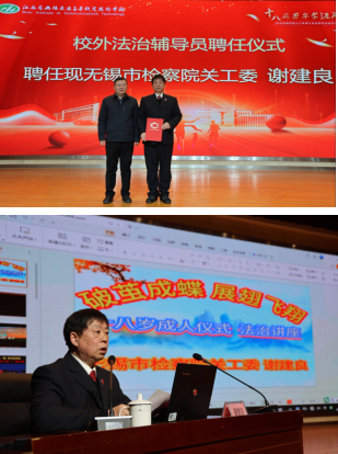 學(xué)院聘任無錫市檢察院關(guān)工委法治宣講員謝建良為校外法治輔導(dǎo)員,強(qiáng)化青少年法治教育,為成長保駕護(hù)航。最后,謝建良檢察官以《破繭成蝶 展翅飛翔》為主題作精彩分享,從法治視角解析青年成長路徑,鼓勵學(xué)生突破舒適區(qū),在時代浪潮中勇立潮頭。