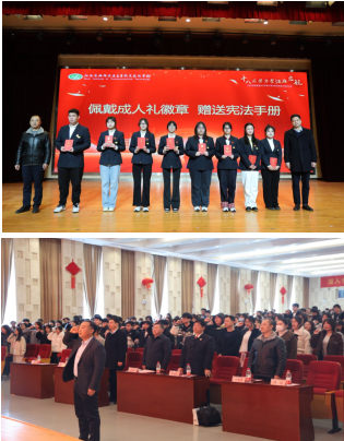 在莊重的成人禮環(huán)節(jié),教務(wù)處處長夏春榮、學(xué)生工作處處長王光祥為學(xué)子佩戴成人禮徽章并贈送憲法手冊,象征法律賦予的權(quán)利與義務(wù)。物流管理學(xué)院副院長張龍枝老師帶領(lǐng)全體學(xué)生面向國旗宣誓,誓言錚錚,回蕩禮堂。