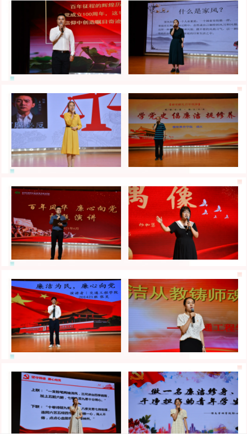 本次演講比賽由學(xué)校各黨總支(直屬黨支部)推薦的19位師生參加。參賽選手們圍繞黨史學(xué)習(xí)、黨風(fēng)廉政建設(shè)、師德師風(fēng)建設(shè)、好家風(fēng)故事、中國精神等,立足崗位、緊扣主題,以真摯的情感、流暢的語言,聲情并茂地謳歌了黨、謳歌了祖國,贊頌了中華優(yōu)秀兒女的優(yōu)良作風(fēng)和良好家風(fēng),展示了學(xué)校教師堅守師德、廉潔從教的精神風(fēng)貌,詮釋了忠誠、廉潔、擔(dān)當(dāng)?shù)闹匾饬x和歷史使命。經(jīng)過激烈地角逐,比賽最終評選出一等獎2名,二等獎4名,三等獎6名,優(yōu)秀獎7名。
